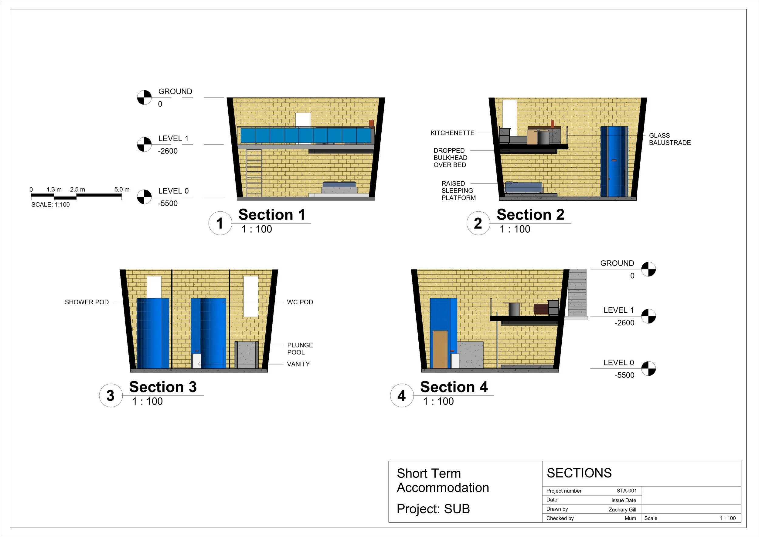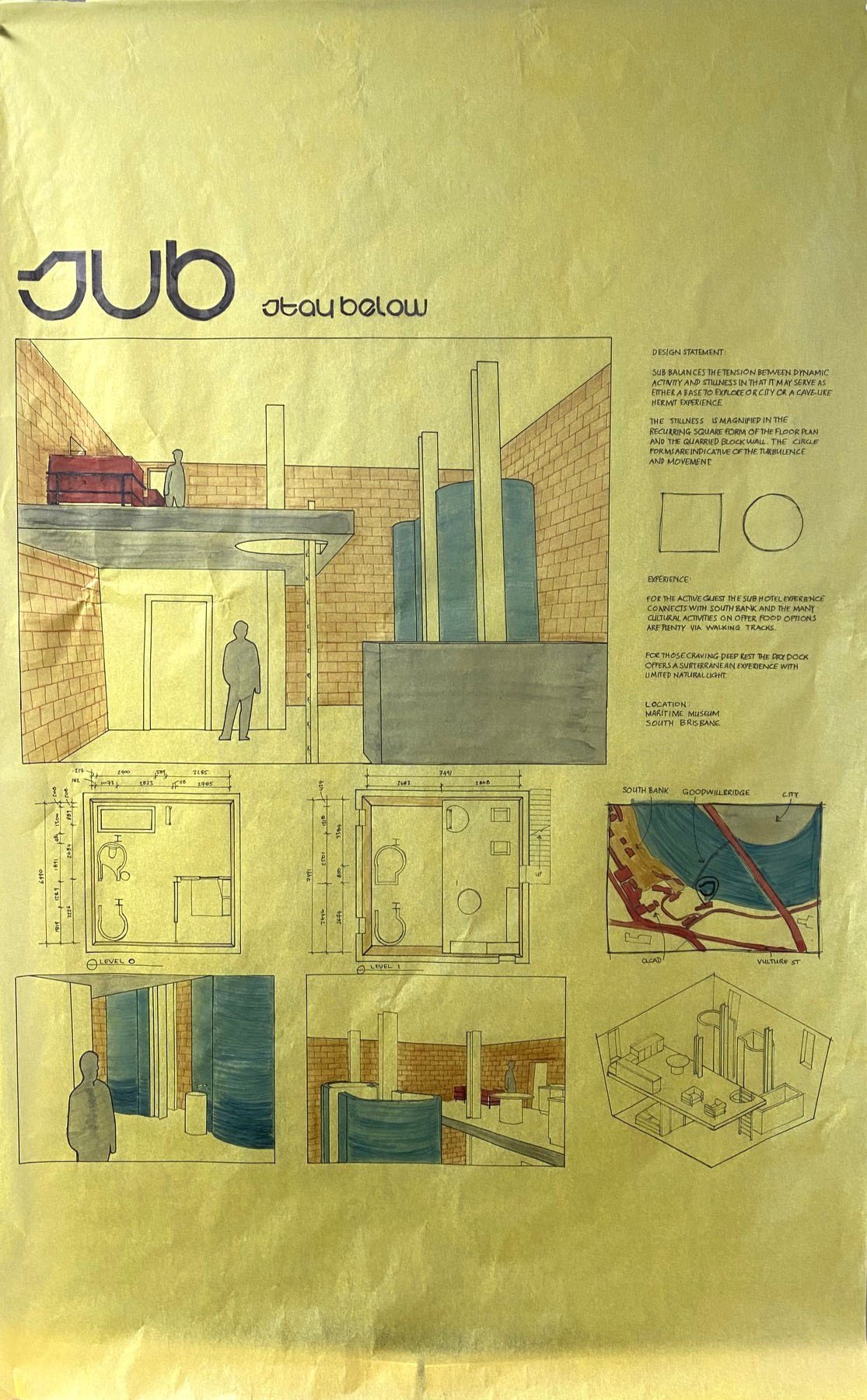 Sub, a pixel (micro) hotel in the pump pit of the South Brisbane dry dock explores repurposing urban industrial spaces as short term accommodation. Reactivating these under-utilised spaces through accommodation balances tourism and returning inner-city housing stock to the long-term rental market.